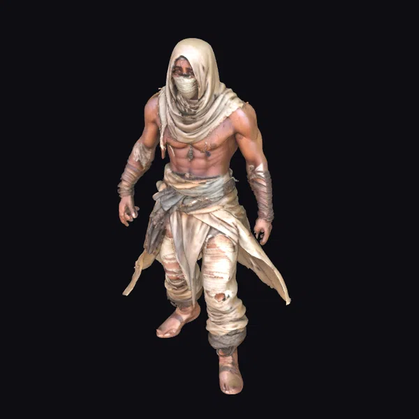 This imposing figure, clad in the remnants of a once-protective garb, exudes an aura of resilience and strength. The desert warrior’s muscular build is evident, despite his attire being torn and frayed, suggesting a recent and intense battle or a harsh desert environment. His head is covered, with only his intense gaze visible, adding to his mysterious and formidable presence. The detailed textures of his skin, the intricate folds of his clothing, and the dynamic pose capture a moment of readiness and vigilance. Ideal for projects requiring a character that embodies the essence of a desert warrior, this model can bring authenticity and depth to games, animations, and designs.