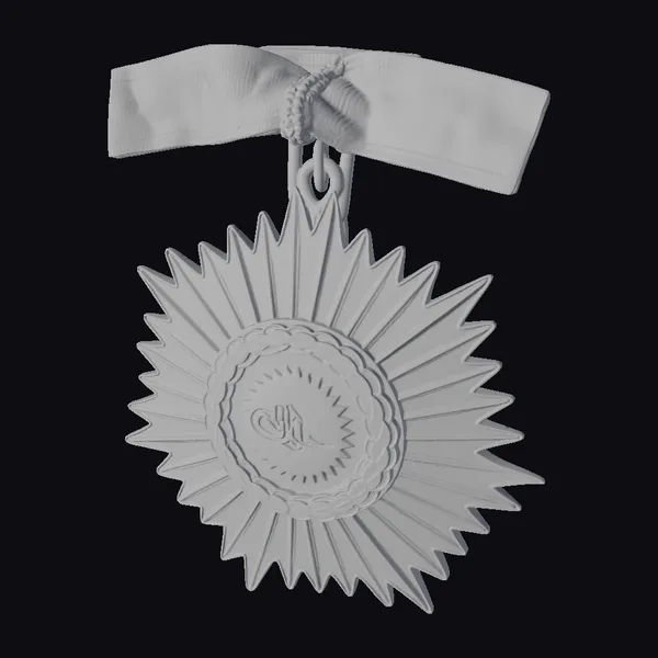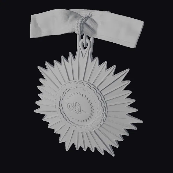 Crafted with meticulous attention to detail, this stunning starburst medal boasts a golden center adorned with an intricate design, encircled by a vibrant red border that adds a pop of color. The medal’s body is a masterful arrangement of sharp, pointed shapes, each studded with sparkling diamonds that catch the light. Suspended from a luxurious red ribbon with golden stripes, this medal exudes an air of prestige and honor. Its exceptional detail and realistic appearance make it perfect for use in high-end applications such as game development, animation, and design projects requiring a touch of luxury.
