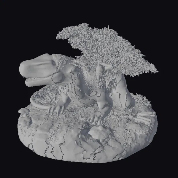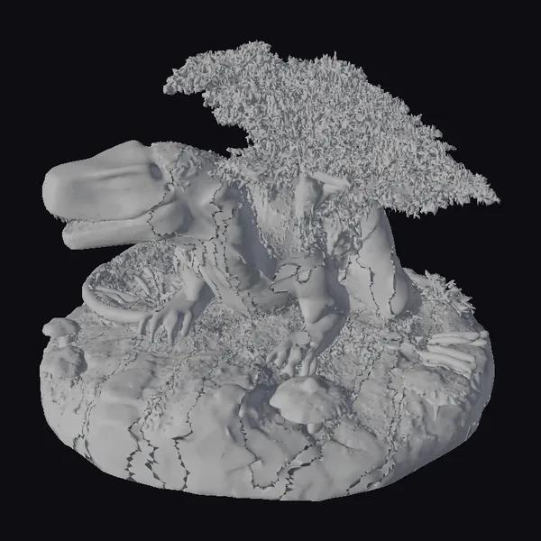 In a harmonious blend of nature and myth, a T-Rex sits regally on a rocky outcrop, its body covered in moss and lichen, supporting a lush pink tree that blooms generously. The base, a tapestry of moss, gray rocks, and vibrant pink flowers, adds depth and color to the scene. The dinosaur’s pose, with its mouth slightly ajar, suggests a moment of peaceful coexistence with nature. This model is perfect for projects requiring a fantastical, serene element, such as animations, games, or architectural visualizations aiming for a whimsical touch. Its detailed textures and balanced composition make it a versatile asset for various creative ventures.