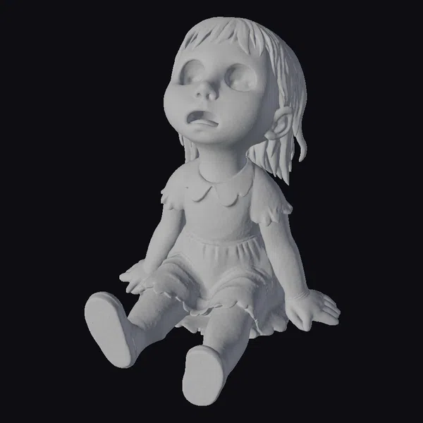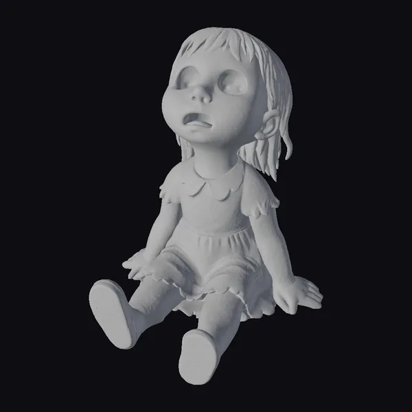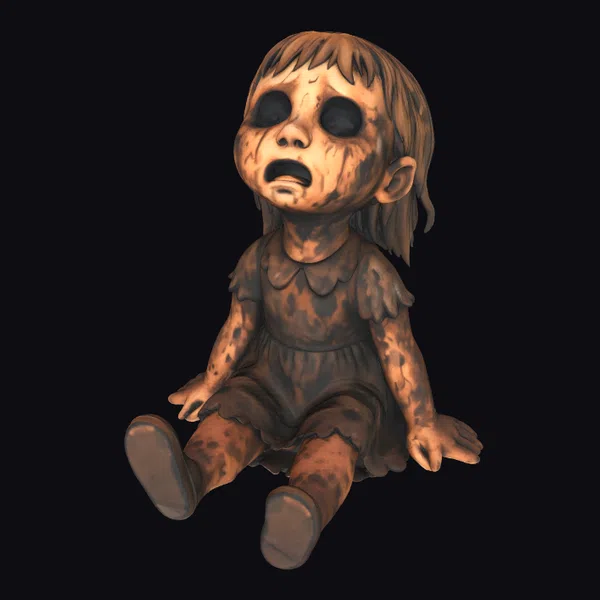 Detailed with precision, this stylized model of a dirty little girl captures a moment of horror and despair. She sits with her legs stretched out, her mouth open in a silent scream, and her black eyes seem to pierce through the darkness. Her brown hair is unkempt, framing a face smudged with dirt and distress. The torn dress and dirty skin accentuate her abandoned and scared state. This model is perfect for projects requiring a creepy, horror element, such as games, animations, or VR/AR experiences that delve into the darker side of fantasy.