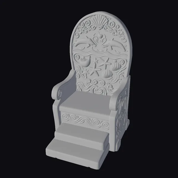 Positioned grandly, the Dolphin Shell Throne exudes an air of regal elegance, its weathered stone steps leading up to a seat that seems to whisper stories of the deep. The throne’s back is a marvel of detailed craftsmanship, with dolphins leaping across waves, surrounded by a medley of oceanic treasures: shells, starfish, and swirling sea motifs. The contrast between the cool, beige stone and the warm, earthy brown of the seat’s upholstery adds a layer of depth, suggesting a blend of natural and crafted elements. This throne doesn’t just command a presence; it transports you to a realm where myth and majesty converge. Ideal for projects that demand a touch of fantasy and the grandeur of the sea, it serves as a stunning centerpiece for games, animations, or virtual environments aiming to capture the imagination.
