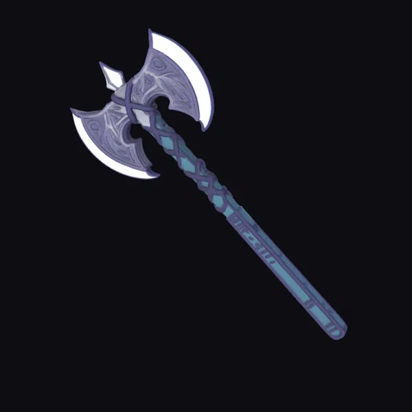The Double Headed Battle Axe stands imposingly, its dual blades curved and sharp, ready for battle. The handle, adorned with a mesmerizing pattern of interlocking blue and purple shapes, seems to shimmer in the light. The axe’s overall design exudes a sense of ancient, mystical power. Its detailed textures and ornate features make it a stunning addition to any fantasy setting, perfect for use in games, 3D printing, VR/AR experiences, animation, and design projects.