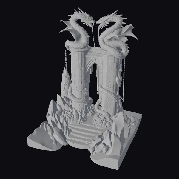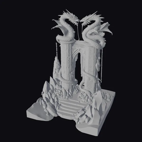 In a majestic pose, two dragons dominate the top of this intricately designed archway, their scales glistening with a subtle sheen. The stone structure beneath them is adorned with glowing red runes that seem to pulse with an otherworldly energy. The dragons’ bodies twist and turn, as if alive, while chains hang from their mouths, adding a sense of dynamic movement. The base of the archway is surrounded by jagged rocks and debris, suggesting a long-abandoned entrance to a hidden world. This model is perfect for use in games, 3D printing, VR/AR experiences, animation, and design projects where a touch of fantasy and mystery is needed.