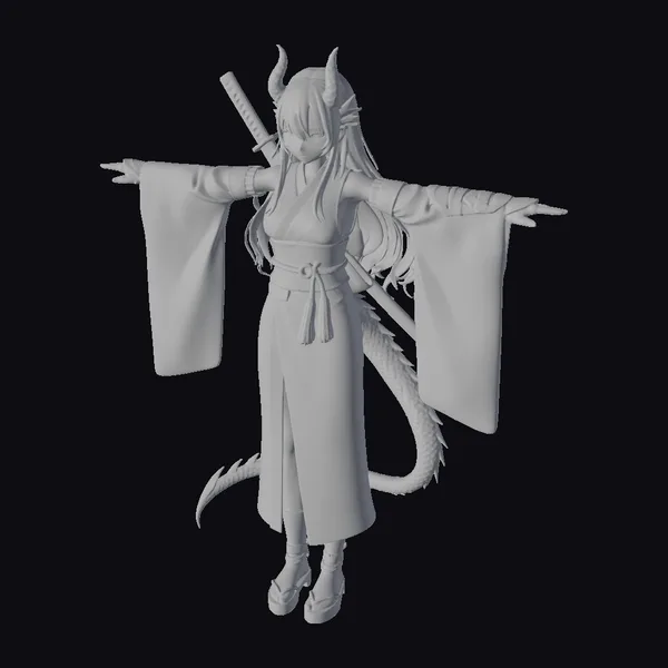 Gazing upon this dragon empress, her poised stance commands attention, with one sword securely fastened on her back and her arms outstretched to reveal her impressive wingspan. Her long, flowing red hair cascades down her back like a fiery waterfall, while her dark blue kimono with gold floral patterns exudes an air of mystique and power. The bold red accents on her outfit add a touch of fierce elegance, mirroring the vibrant hue of her dragon tail. Crafted with meticulous detail, this model is perfect for projects requiring a blend of fantasy and oriental aesthetics, such as animation, game development, or architectural visualizations. Its high-quality design ensures it will be a focal point in any scene, from video games and animations to 3D printing and virtual reality experiences.