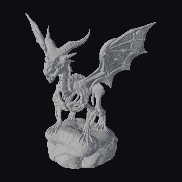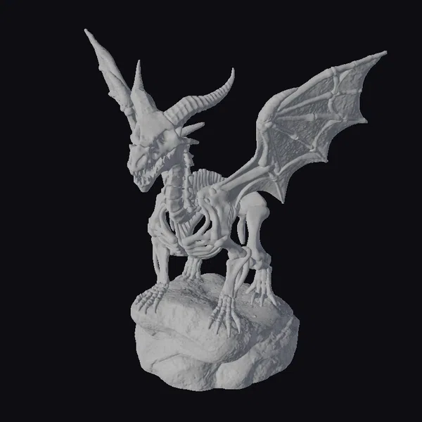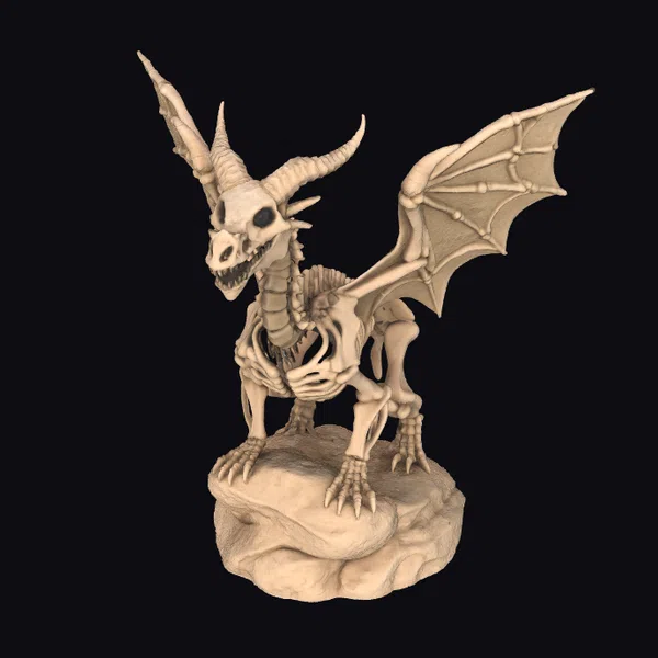 The dragon skeleton figurine stands poised on a jagged rock base, its body a masterclass in detailed modeling. The granular texture gives the impression of aged, weathered bone, while the pose suggests dynamic movement. Two curved horns reach upwards, adding to the creature’s menacing presence. Its wings are spread wide, revealing a complex network of bones. The jaws are frozen in a perpetual snarl, complete with razor-sharp teeth. This model is perfect for use in games, 3D printing, VR/AR experiences, animation, and design projects, particularly those with a fantasy or horror theme.