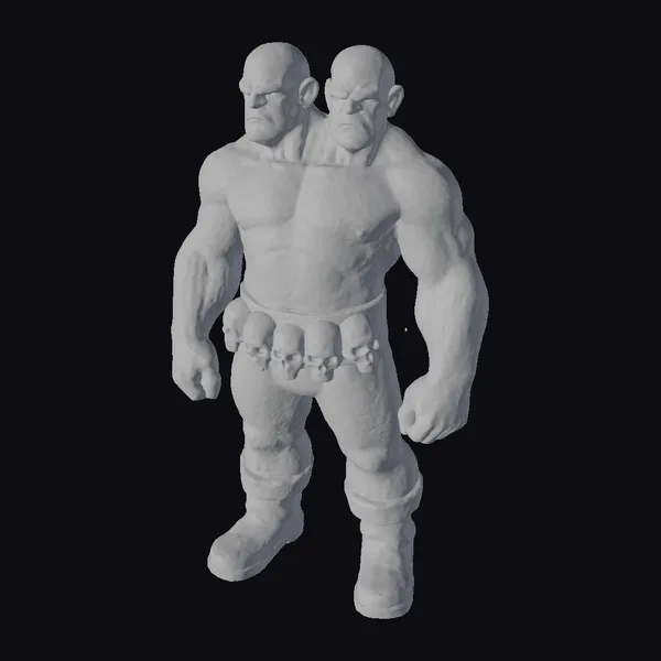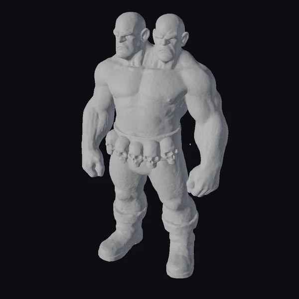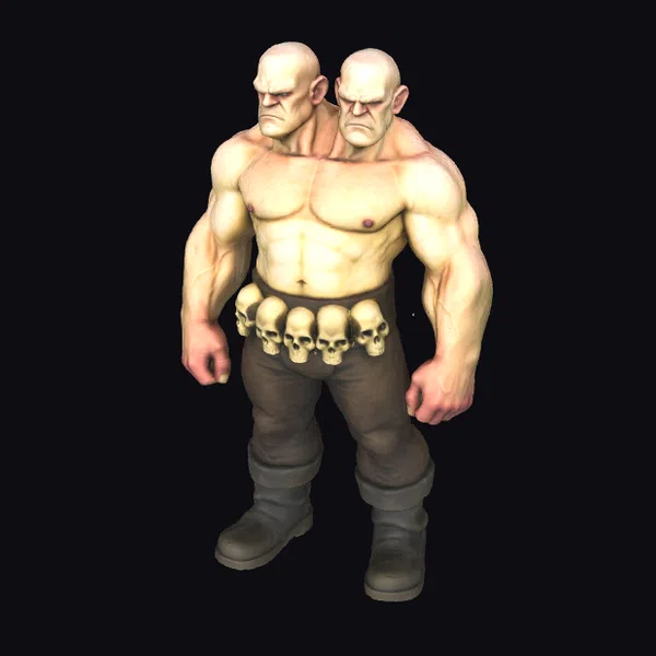 Detailed with precision, this dual-headed giant stands with a wide stance, showcasing his immense muscular build. Each head is sculpted with a scowl, contributing to the overall menacing appearance. The belt around his waist, adorned with small skulls, adds a macabre touch to his already formidable physique. His dark pants and boots contrast with his pale skin, making him a striking figure. This model is perfect for projects requiring a dark fantasy element, suitable for games, animations, or 3D printing. The level of detail, from the texture of his skin to the shading of his muscles, ensures a high-quality visual impact.