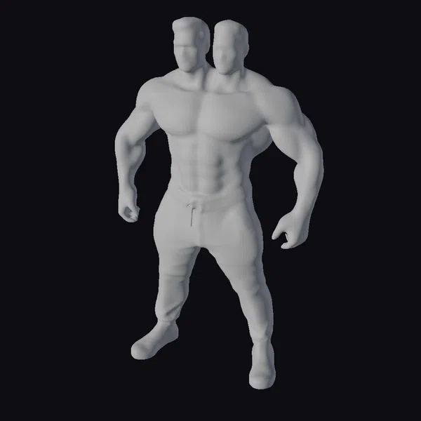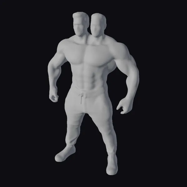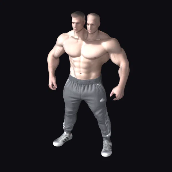 Detailed with precision, this 3D model showcases a muscular man with two heads, each sporting a distinct hairstyle, one short and the other buzzed. His physique is well-defined with pronounced muscles, and he wears gray adidas pants that are rendered with realistic fabric folds and textures. The model is set against a plain white background, highlighting his features. Ideal for use in games, animations, or designs where a strong, unique character is needed.
