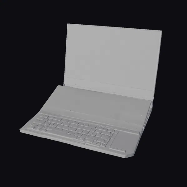 Perched at an angle, the laptop’s dual screens glow with an otherworldly light. The primary screen displays a stunning visual of a wing-like object set against a swirling backdrop of pink, purple, and blue hues. The keyboard, a kaleidoscope of colors, gradates from green to blue, red, and purple, adding a touch of whimsy to the overall design. The laptop’s body, a sleek gray, provides a sophisticated contrast to the playful keyboard and screens. This model is perfect for use in games, animations, or architectural visualizations where a cutting-edge device is needed. Designers and developers can also use this model to create realistic product demos or to enhance their digital environments.