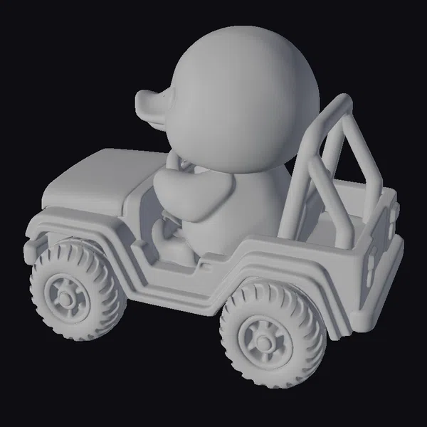 Sitting proudly behind the wheel of a miniature green jeep, a cheerful cartoon duck takes center stage in this delightful 3D model. The duck’s bright yellow feathers and large, expressive eyes are meticulously detailed, while the jeep’s earthy tones and chunky tires add a touch of ruggedness. The overall effect is a playful, humorous scene that’s sure to bring a smile.