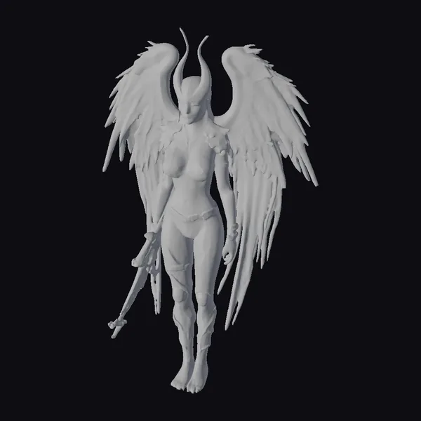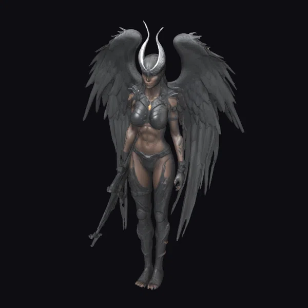 Standing tall with her wings spread wide, this dusktalon eagle huntress showcases a mesmerizing combination of physical prowess and futuristic sci-fi elements. Her physique is meticulously detailed, from the defined muscles to the subtle shading that suggests a blend of human and avian features. The armor, predominantly black and gray, is adorned with metallic accents, adding a touch of sophistication to its overall design. A helmet with two curved horns tops her head, completing her warrior appearance. The contrast between her rugged, battle-ready stance and the sleekness of her armor creates a compelling visual narrative. This model is perfect for projects requiring a strong, futuristic female character, suitable for games, 3D printing, VR/AR experiences, animation, and design applications.
