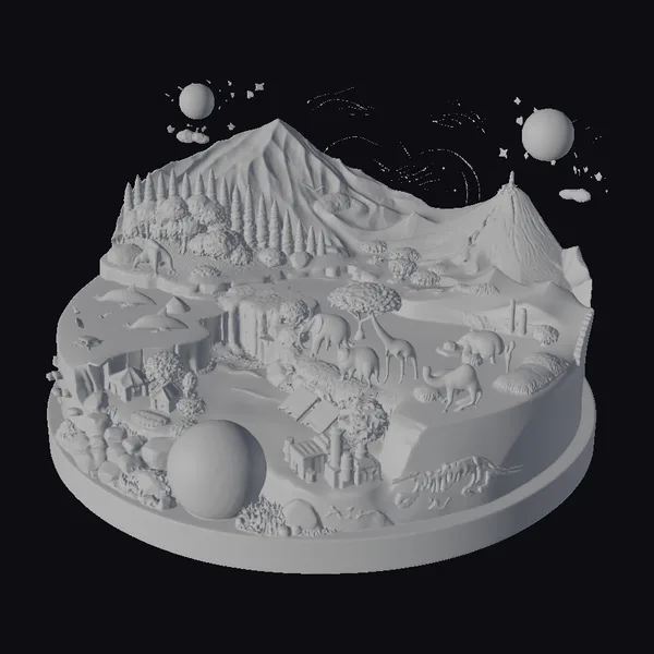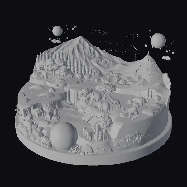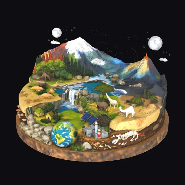 Gaze upon a meticulously crafted, stylized representation of Earth’s cross-section, where every detail invites curiosity. The model presents a harmonious blend of natural and man-made elements, set against a backdrop of rugged terrain, towering mountains, and a winding river that cascades into a breathtaking waterfall. The landscape is dotted with a variety of flora and fauna, including elephants, llamas, and a zebra, emphasizing the rich biodiversity of our planet. A small, detailed globe and solar panels are nestled among the industrial components, symbolizing the intersection of human activity and environmental consciousness. This model is perfect for educational purposes, games, print materials, VR/AR experiences, and animations, offering a visually engaging way to explore and learn about Earth’s ecosystems and the importance of ecological balance.
