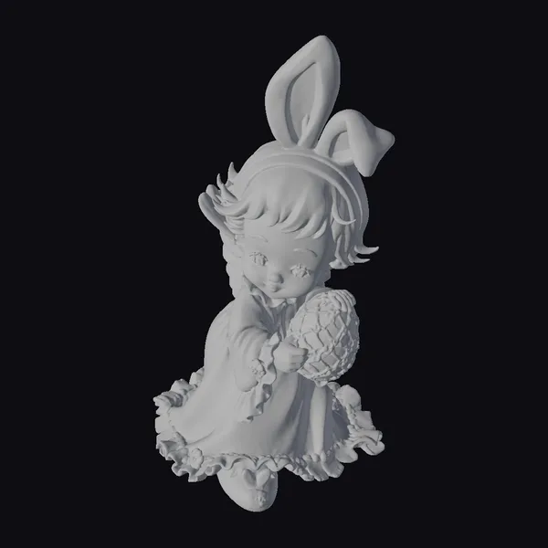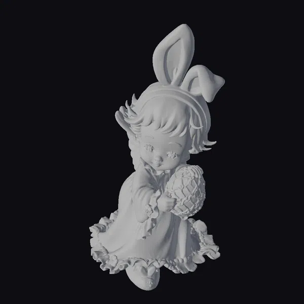 Perched on a ruffled white dress with golden accents, this little girl figurine exudes Easter charm. Her blonde hair is styled in soft, flowing locks, and her bright blue eyes sparkle with delight. A pair of bunny ears adds a playful touch to her head, while a large blue Easter egg with golden details cradles in her arms. The intricate textures and pastel color palette evoke a sense of whimsy and wonder. This figurine would be perfect for Easter-themed games, animations, or 3D printing projects. Its stylized features and delicate details make it a great addition to any creative project.