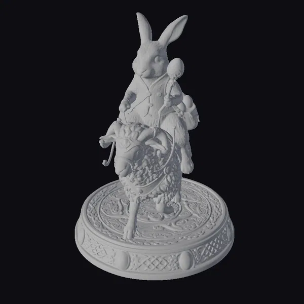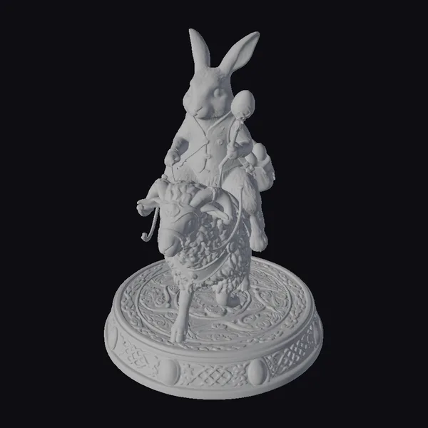 In a stunning display of fantasy and festivity, a charming Easter bunny sits regally on the back of a ram, both creatures showcasing exquisite detail and texture. The bunny, dressed in a richly decorated vest complete with a prominent red gem, holds a basket overflowing with multicolored Easter eggs. The ram, with its woolly coat and ornate headpiece featuring a bright gem, stands proudly on a round, green base adorned with Celtic-inspired patterns. This 3D model is perfect for use in games, animations, or as a unique design element, offering a blend of fantasy and seasonal charm that is sure to captivate audiences. The model’s intricate details, from the textures of the animals to the decorations on the base, make it a standout choice for projects seeking a touch of magic and wonder.
