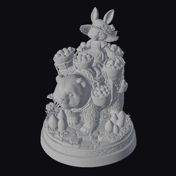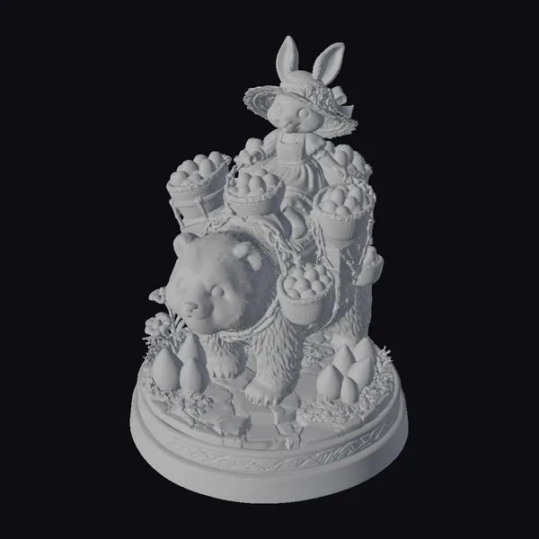In a vibrant Easter celebration, a bunny girl wearing a straw hat adorned with flowers sits atop a panda, which is burdened with multiple baskets overflowing with pastel-colored Easter eggs. The panda, with its distinctive black and white fur, walks on a stone path lined with greenery and flowers, adding to the festive mood. Scattered around the base are additional eggs, some decorated, others plain, enhancing the scene’s playfulness. The model showcases intricate details such as the texture of the panda’s fur, the weave of the baskets, and the delicate patterns on the eggs. This model is perfect for use in animations, games, or as a decorative piece for Easter-themed projects.