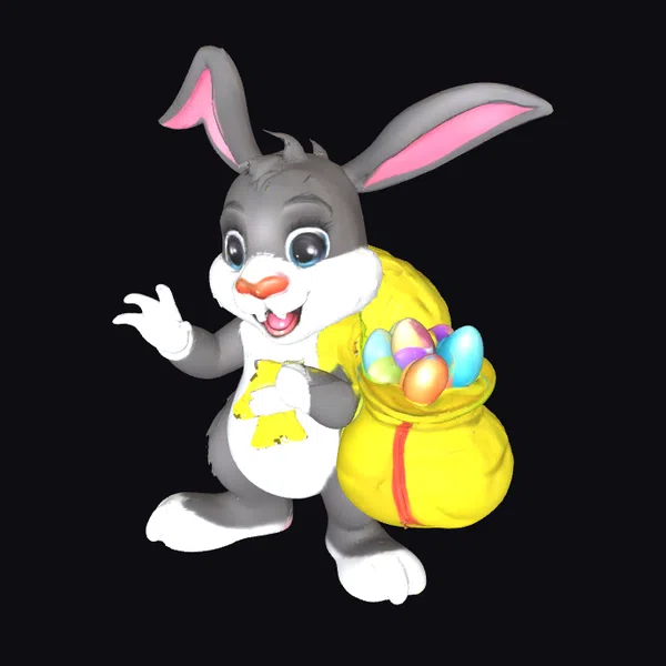 Detailed in every aspect, this Easter Bunny 3D model showcases a delightful character with oversized ears and a fluffy gray and white coat. The bunny’s large, sparkling eyes and wide orange nose add to its endearing appearance. A bright yellow bow tie complements its cheerful demeanor. The bunny carries a large yellow sack adorned with a red stripe, filled to the brim with an assortment of colorful Easter eggs. The model is well-suited for various applications, including games, animations, 3D printing, and virtual reality experiences, offering a versatile and engaging character for Easter-themed projects or general festive content.