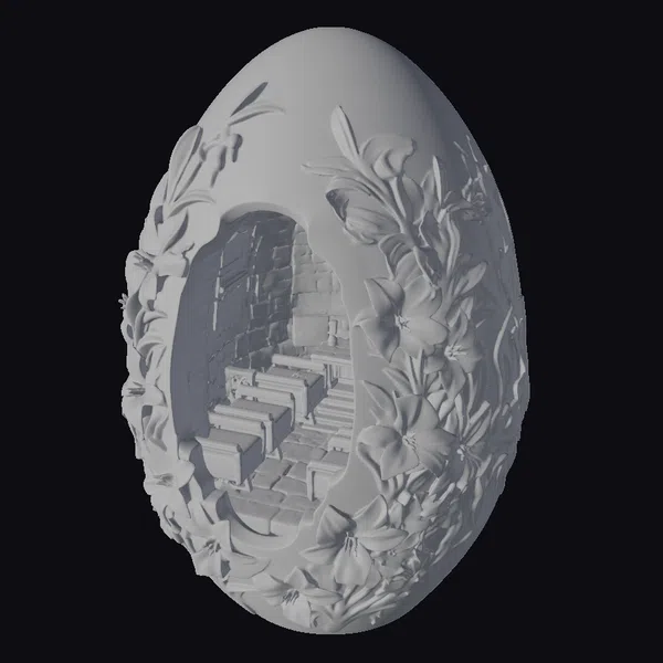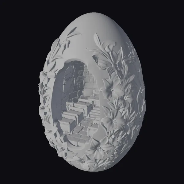 Gaze into the intricately crafted Easter Egg Diorama, where a beautifully rendered interior scene unfolds. The egg’s exterior boasts a stunning floral pattern, with pink and white flowers, green leaves, and subtle stone-like textures. Upon closer inspection, the hollow interior reveals a quaint setting: a stone wall with a small green object, rows of wooden pews, and a stone floor. This charming diorama is perfect for use in Easter-themed games, animations, or 3D printing projects. Its unique blend of whimsy and detail makes it an eye-catching addition to any creative project.