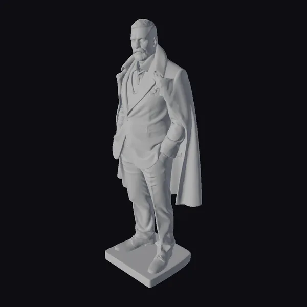 This highly detailed 3D model captures the essence of Talaat Harb, the Egyptian economist and founder of Banque Misr, in a pose that commands respect. The statue is rendered in a realistic style, with a focus on accurate proportions and lifelike textures. The economist is dressed in formal attire, complete with a suit, vest, and coat draped over his shoulders. His hands are casually placed in his pockets, adding a touch of personality to the otherwise dignified pose. The model is set against a clean white background, allowing the intricate details of the statue to take center stage. The level of detail in this model makes it suitable for a variety of applications, including games, 3D printing, virtual reality, animation, and design projects.
