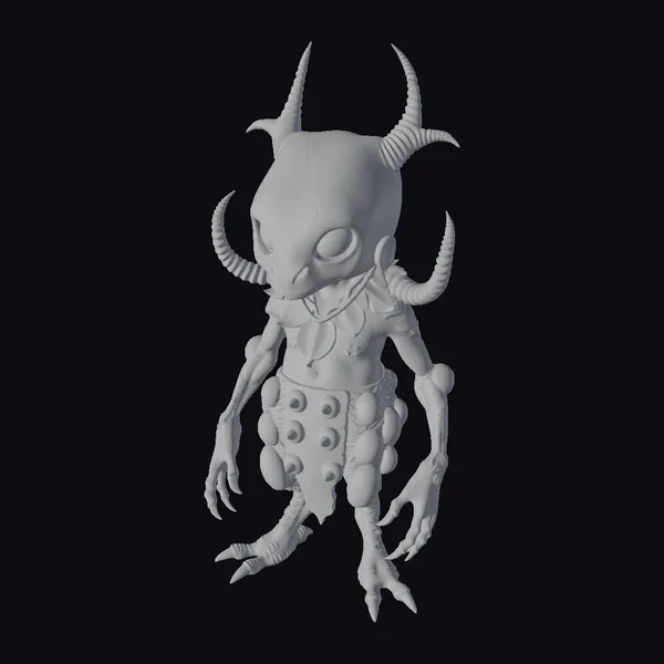 This fantastical being stands out with its intricately designed head, featuring a pattern of white swirls on a gray base, complemented by curved horns and large, expressive eyes. The creature’s body is a marvel of whimsical design, with a blue shirt and red pants, both embellished with egg-like shells. The limbs are adorned with red and blue bands, culminating in sharp, claw-like nails. The entire figure exudes a playful yet mysterious aura, making it a captivating addition to any fantasy setting. Ideal for use in games, animation, or as a unique design element.