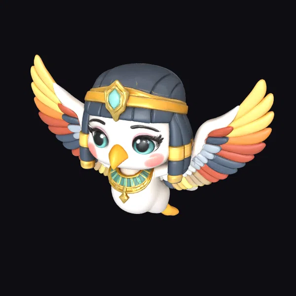 This stunning figurine captures the essence of the Vulture Goddess, Nekhbet, in a chibi style that’s both playful and majestic. Her body is predominantly white, with wings that transition from yellow to orange and red, giving the impression of mid-flight. The goddess wears a dark blue headdress with a golden band and a large turquoise gemstone. Her eyes are a bright teal, adding to her captivating presence. The golden accents on her wings, headdress, and necklace catch the light, suggesting a model that’s rich in detail and texture. The blend of stylized features with realistic textures makes this model perfect for projects requiring a mythological touch, such as animations, games, or architectural visualizations. Its unique blend of fantasy and historical elements can add depth and intrigue to any 3D scene.