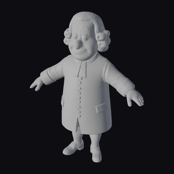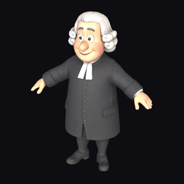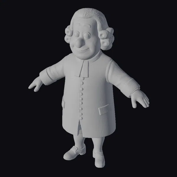 Detailed with care, this 3D model of an elderly clergyman captures a moment of serene engagement. He stands with arms outstretched, as if in the midst of a comforting gesture. His facial features are soft and approachable, with rosy cheeks and a warm smile. The model showcases a meticulous attention to detail, from the curls of his white hair to the buttons on his long, dark coat and the crisp white necktie. The texture of his clothing and the subtle shine on his black shoes add depth to the model. Ideal for projects requiring a historical or religious figure, this model can be used in animations, games, or as a detailed addition to 3D environments, offering a character that exudes peace and understanding.