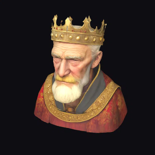 This meticulously crafted bust showcases an elderly king with a commanding presence. His facial features are deeply etched with age, highlighted by a long white beard and hair that frames his stern expression. The golden crown, adorned with precious stones, sits atop his head, while a luxurious red robe with golden accents drapes over his shoulders. The intricate details of the robe’s texture and the crown’s design reflect a high level of craftsmanship. This model is perfect for use in historical or fantasy settings, ideal for games, 3D printing, VR/AR experiences, animation, and design projects.