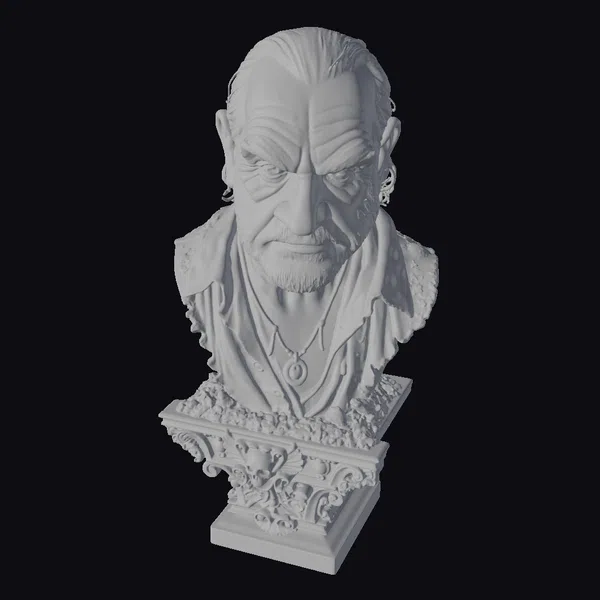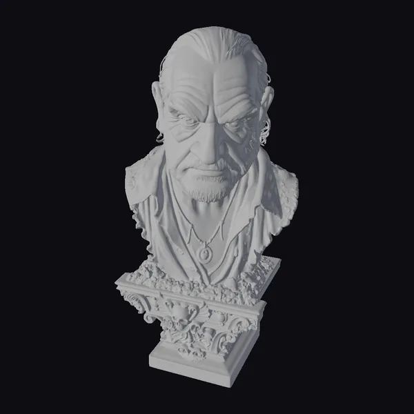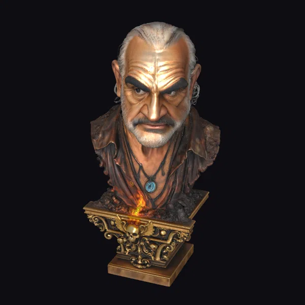 This highly detailed bust sculpture presents a grizzled elderly man with a commanding presence. His face, characterized by deep wrinkles and a distinctive graying beard, is set against a backdrop of a brown, leather-like collar. The man’s attire is complemented by multiple necklaces, one of which features a striking blue pendant. The bust itself is mounted on an ornate golden base, adorned with flames and intricate designs, adding a sense of drama and luxury. The realistic style and attention to detail make this model suitable for a variety of applications, including games, 3D printing, VR/AR experiences, animation, and design projects. The high level of detail, especially in the facial features and textures, ensures a lifelike appearance that can enhance any visual project.