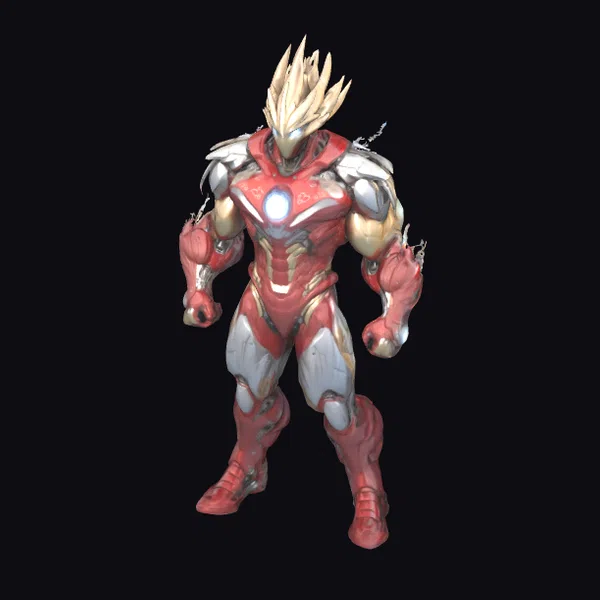 Standing dynamically with fists clenched, this electric superhero exudes confidence and strength. The intricate details of the metallic armor reveal a complex design, with silver and gold accents that suggest advanced technology. The red and silver body suit appears both protective and visually striking, complete with glowing circuits and a radiant emblem on the chest. The blonde hair spikes upwards, adding to the character’s energetic and powerful stance. This model is perfect for projects requiring a dynamic superhero character, suitable for games, animation, VR/AR experiences, and design projects.