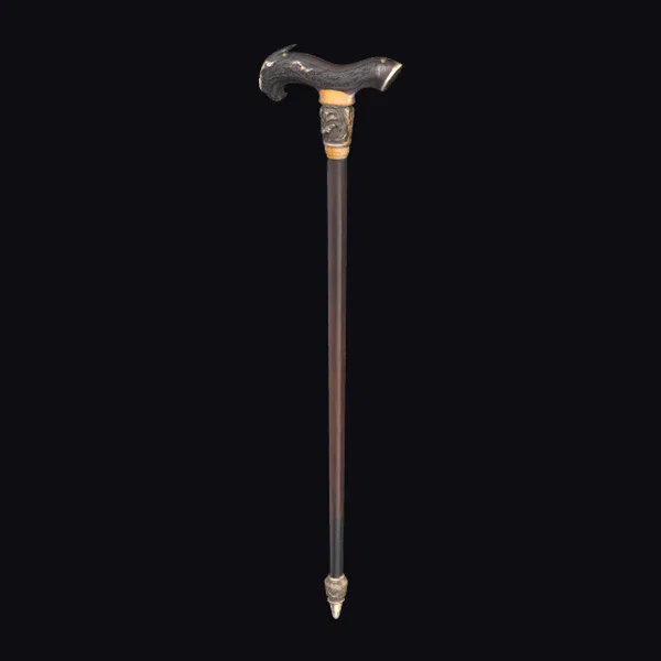 The elegant cane is meticulously crafted with a dark wooden shaft that exudes classic charm. Its handle, shaped like an antler, is a masterpiece of detailed design, complemented by golden accents that not only add a touch of opulence but also highlight the craftsmanship. The golden details are present at the top and bottom of the cane, providing a seamless blend of elegance and functionality. The overall design of the cane suggests a piece that could be used in various contexts, from adding a vintage flair to a character in a game or animation to serving as a prop in a historical or fantasy setting. Its detailed texture and realistic appearance make it suitable for high-quality 3D projects, including VR/AR experiences, architectural visualizations, or even print-on-demand products.