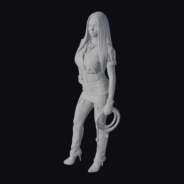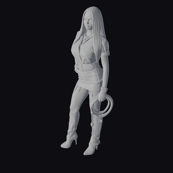 Detailed with precision, this 3D model showcases a poised female biker standing tall in a chic black ensemble. The outfit includes a fitted leather jacket and skirt, complemented by see-through stockings and high-heeled boots. Her long, dark hair flows down, adding to her edgy yet elegant appearance. She holds a whip in one hand, exuding a sense of control and sophistication. The model’s intricate details make her suitable for various applications, including game development, animation projects, and virtual reality experiences. The high-quality textures and realistic proportions ensure a seamless integration into any digital environment.