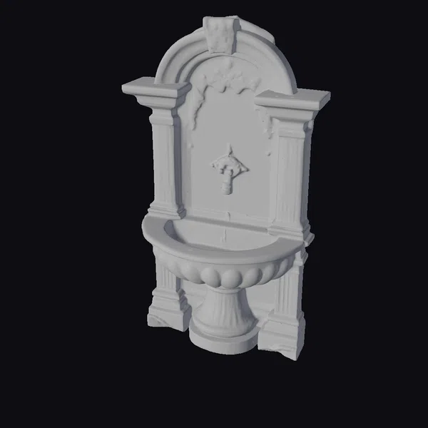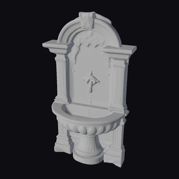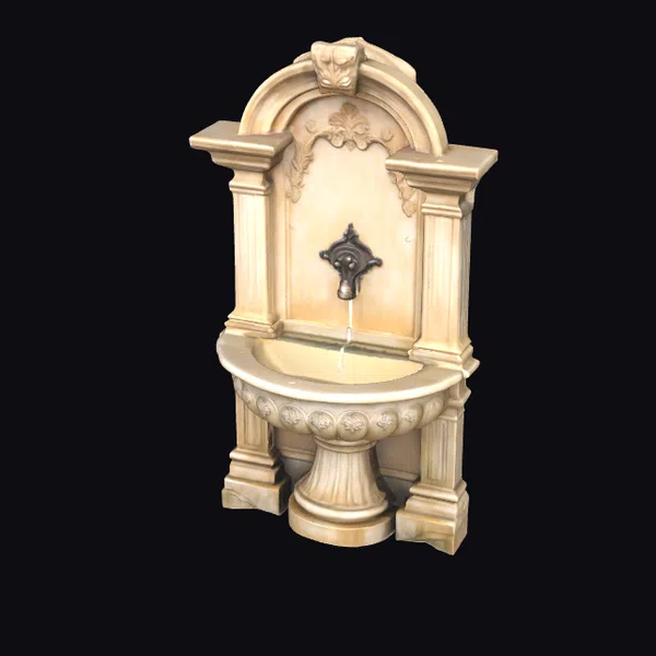Positioned against a plain backdrop, the fountain’s beige stone structure stands out with its smooth, slightly weathered texture and warm undertones. The basin, adorned with a decorative rim, collects water flowing from a central bronze spout, set against a beautifully carved floral backdrop. The overall design, complete with flanking columns and a decorative top, evokes a sense of timeless elegance. Ideal for adding a touch of sophistication to gardens, patios, or indoor spaces, this model is perfect for 3D rendering in architectural visualizations, garden designs, or as a serene element in animations and games.