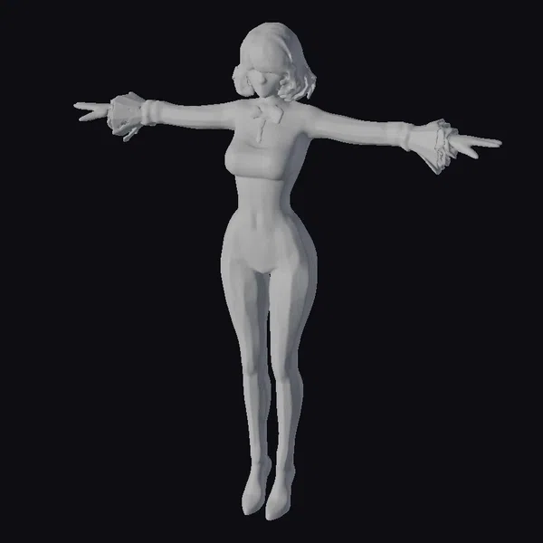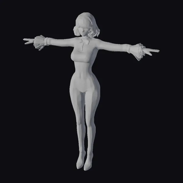 Depicted in a T-pose, this 3D model of a young woman showcases a striking Victorian-inspired outfit. She wears a sleek black high-waisted garment that cinches at the waist, paired with a white long-sleeve top adorned with a stylish black bow tie and frilly cuffs. Her brown hair is styled in a chic, short cut with bangs. The model’s poised stance, with arms outstretched to the sides, highlights her elegant attire and refined posture. The realistic style and attention to detail make this model suitable for various applications, including games, 3D printing, VR/AR experiences, animation, and design projects. The model’s intricate details, from the texture of her clothing to the expression on her face, ensure a high-quality visual experience.