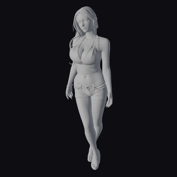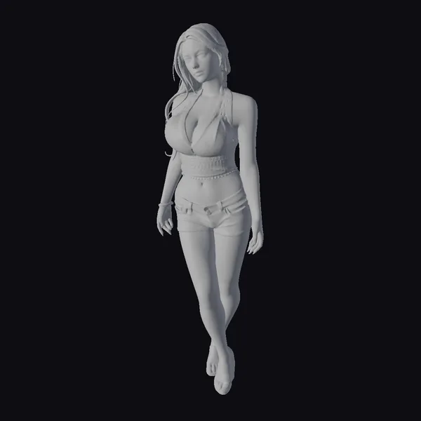 Detailed from head to toe, this 3D model showcases a poised woman with a confident stride. Her beige halter top is embellished with intricate designs, complemented by a matching belt around her waist. The black pants and high heels accentuate her figure, while her dark hair flows down one shoulder. The model’s facial features are delicately rendered, with a subtle expression that exudes sophistication. Ideal for projects requiring a touch of elegance, this model can be used in games, 3D printing, VR/AR experiences, animations, and designs where a stylish female character is needed.