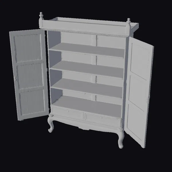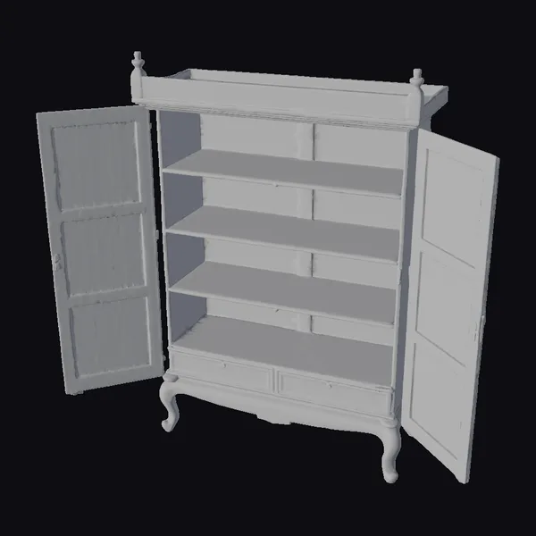Gaze upon the intricate details of this exquisite wooden storage cabinet, its doors open to reveal a spacious interior with four shelves and two drawers. The rich, dark wood tone is complemented by lighter accents, adding depth and visual interest. The cabinet’s curved legs and ornate carvings on the front and top showcase exceptional craftsmanship. As a 3D model, this cabinet can be used in various applications, such as interior design projects, architectural visualizations, or even video game environments. Its classic design ensures it will remain a timeless piece, suitable for a range of settings, from traditional to modern. The model’s high level of detail, from the texture of the wood to the subtle shading, makes it an excellent choice for designers and artists seeking to add a touch of elegance to their work.