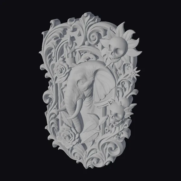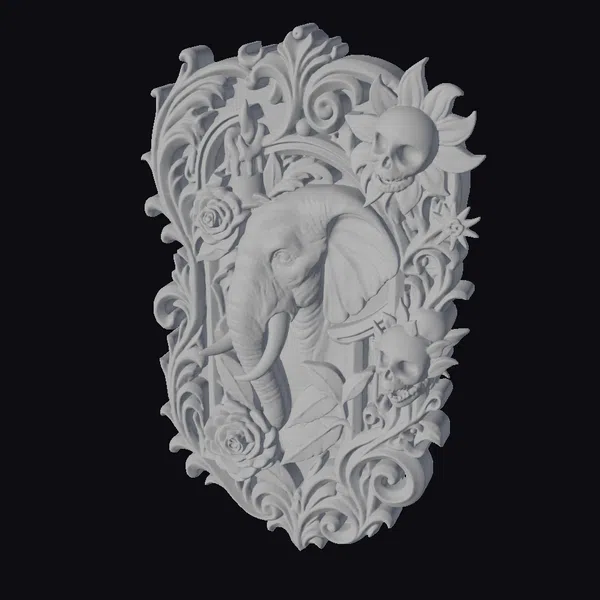 This detailed plaque features an elephant’s head centrally positioned, its texture and wrinkles meticulously rendered. The elephant is surrounded by a flamboyant frame adorned with swirling patterns, enhancing its baroque style. Two skulls, one resembling a sunflower and the other nestled among leaves, add a touch of gothic intrigue. The inclusion of a lit candle and lush flowers, including roses and a prominent sunflower, brings a contrast of life and death themes. The plaque’s ornate design and symbolic elements make it perfect for use in games, 3D printing, VR/AR experiences, animations, and design projects where a touch of mystique and fantasy is desired.