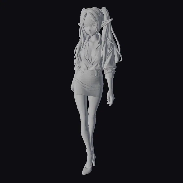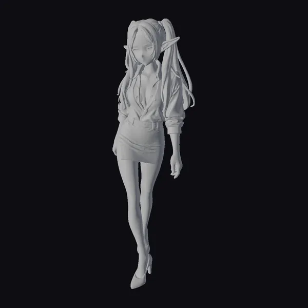 Rendered in a vibrant, stylized anime style, this elf girl model showcases intricate details such as her pointed ears, long flowing white hair, and expressive facial features. She is dressed in a chic outfit consisting of a white shirt and a tan skirt, complemented by black heels. Her pose exudes a sense of calmness and elegance, making her a versatile model for various creative projects. The model is highly detailed, with precise textures and a well-proportioned physique, making it suitable for applications in game development, animation, virtual reality, and 3D printing.