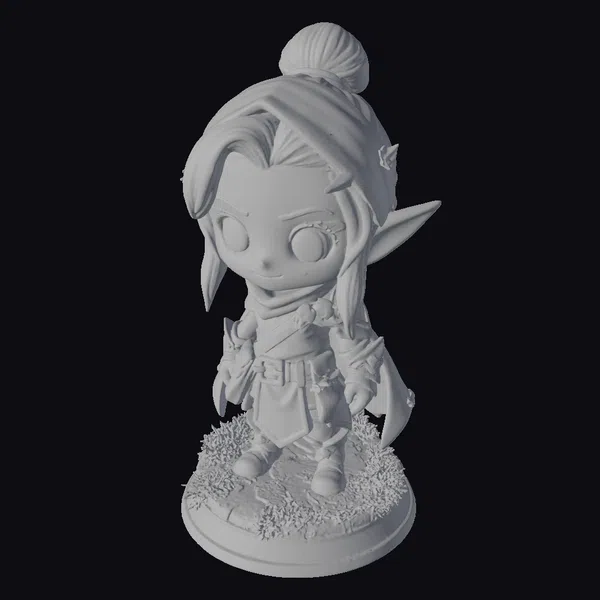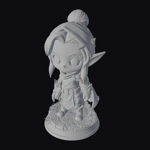 In a pose that exudes a sense of readiness, the elf ranger figurine showcases a meticulously crafted design. His green attire, adorned with earthy tones and subtle textures, appears almost camouflaged against the lush base, which features a mix of grass, moss, and stone. The elf’s facial features are defined by large, expressive green eyes, rosy cheeks, and a gentle smile, all set within a stylized, chibi-inspired aesthetic. The quality of the model is evident in the sharpness of his features, from the delicate points of his ears to the detailed stitching on his clothing. This figurine would be a captivating addition to any collection, and its level of detail makes it suitable for various applications, including games, animation, and print projects.
