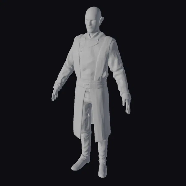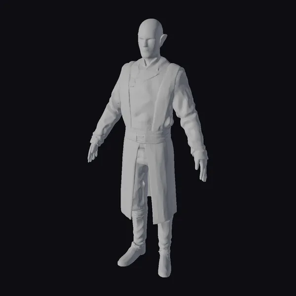 Detailed from head to toe, this sci-fi elf character model boasts a striking appearance. The elf’s short, sleek white hair and pointed ears are accentuated by piercing eyes, set against a backdrop of a high-collared, long silver coat with dark gray stripes and a utility belt. The model’s pose showcases its full-body design, complete with detailed boots and gloves, suggesting a character ready for a futuristic or fantasy narrative. The intricate design elements make it suitable for various applications, including game development, animation projects, or virtual reality experiences.