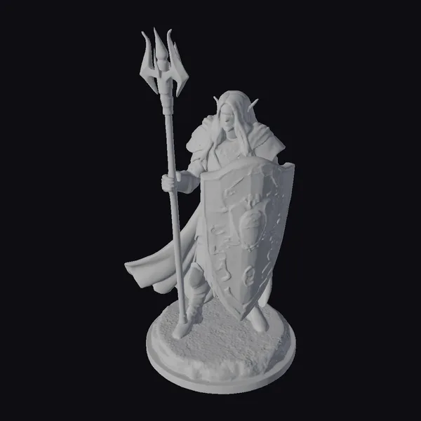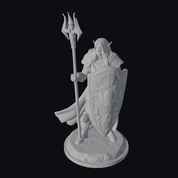 Crafted with meticulous attention to detail, this 3D model of an elf warrior presents a compelling figure. The elf stands on a textured base, suggesting a natural terrain. The armor is richly detailed, with a focus on the chest plate and shoulder guards. The shield, emblazoned with a tree motif, is held firmly in front, while the spear, with its three-pronged tip, is gripped in the warrior’s hand. The model’s pose, with the elf looking down slightly, conveys a sense of readiness and vigilance. The long hair and cape flow behind, adding movement to the static figure. This model is ideal for use in tabletop games, particularly those set in fantasy realms, and can be utilized in 3D printing, virtual reality, or as a detailed addition to digital environments. Its scale and detail make it a versatile asset for game developers, artists, and hobbyists.