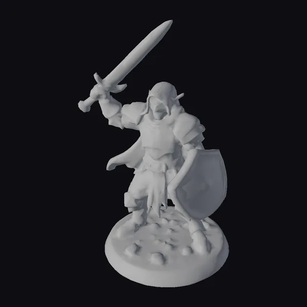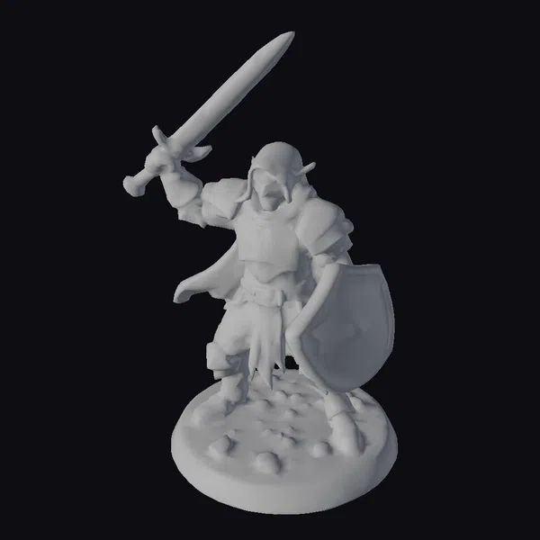 Detailed from head to toe, this elf warrior stands proudly on a rocky base, sword pointed skyward and shield at the ready. The intricate design of the armor, complete with a helmet and cape, captures the essence of a medieval fantasy hero. The model showcases a high level of detail, from the texture of the stone base to the metallic sheen of the sword and shield. Ideal for use in games, 3D printing, VR/AR experiences, animation, and design projects, this model brings a touch of epic fantasy to any project.