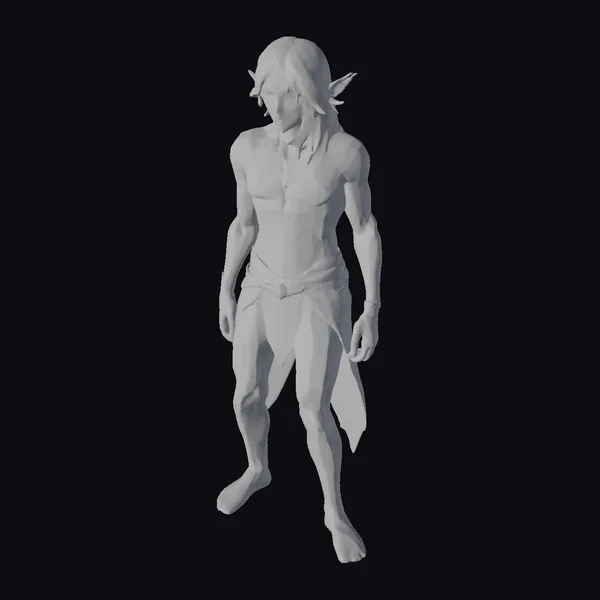 This elf warrior exudes a sense of mystique and power, standing with a slight lean to one side that suggests readiness for battle. The yellow markings on his body are meticulously detailed, tracing paths across his chest, arms, and legs in a pattern that seems both tribal and magical. His long, flowing hair and pointed ears are characteristic of elven lore, while his muscular physique and bare feet ground him in a physical reality. The contrast between the earthy tones of his clothing and the vibrant yellow of the markings creates a visually striking image. This model would be perfect for projects requiring a character with a blend of fantasy and strength, suitable for games, animation, or design work.