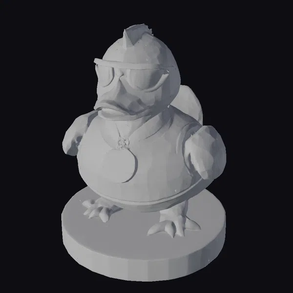 Detailed with a spiky tuft of hair, this stylized rubber duck wears trendy blue sunglasses and a red vest with white trim, complemented by a shiny gold medal around its neck. The duck’s confident stance on a round yellow base, complete with orange feet, adds to its charm. Ideal for games, 3D printing, VR/AR experiences, animation, and design projects, this model brings a fun and quirky element to any creative endeavor.