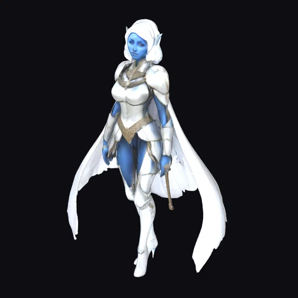 Gaze upon the majestic stance of this elven warrior, her white armor glistening with subtle highlights, complemented by her vibrant blue skin and flowing white hair. The armor’s design is meticulously detailed, with gold accents that add a touch of luxury and power. Her cape flows dynamically behind her, suggesting movement even in stillness. The sword in her hand is a symbol of her readiness for battle. This model is perfect for game developers, animators, and designers looking to infuse their projects with a touch of fantasy and heroism. Its detailed anatomy and realistic style make it versatile for various applications, from animation and gaming to virtual reality experiences.