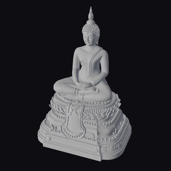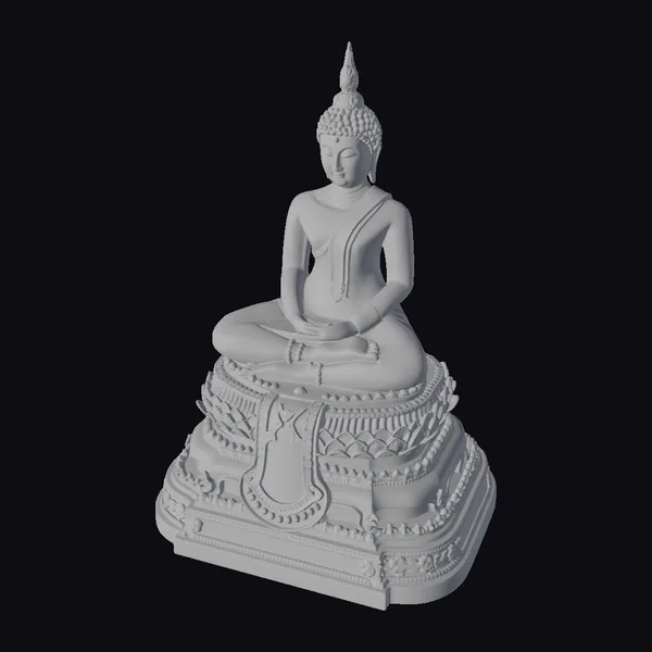 The Emerald Buddha statue is captured in a meditative pose, seated on a multi-tiered golden base that is richly decorated with ornate patterns and a striking red accent. The statue’s green skin contrasts beautifully with the golden headdress and robes, which are meticulously detailed. The serene facial expression and gentle hand positioning convey a deep sense of peace. This model is perfect for use in games, 3D printing, VR/AR experiences, animation, and design projects where a touch of tranquility and cultural richness is desired.
