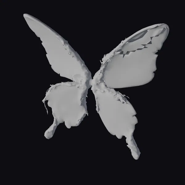 Perched in a state of weightless suspension, the emerald butterfly wings are a marvel of intricate design. The wings’ pose showcases their impressive span, with the upper wings angled slightly forward and the lower wings spread wide. The texture of the wings is a masterful blend of smooth and rough, with the leaf-like veins providing a natural, organic feel. The lighting highlights the delicate patterns and the subtle gradations of color, from the deep green at the base to the pale yellow at the tips. The wings’ jagged edges and frayed tips add a touch of whimsy, suggesting a fantastical creature that might flit through an enchanted forest. These wings would be perfect for use in games, animation, or 3D printing, where a touch of magic and wonder is needed.