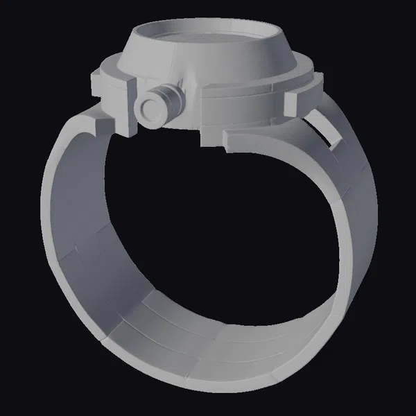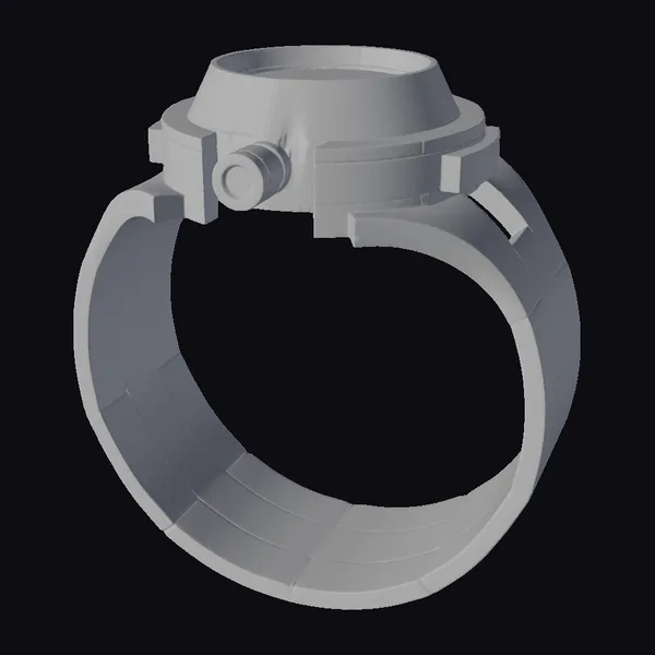 Perched atop a substantial, rounded band, the ring’s central component resembles a miniature, futuristic control panel. The band itself is a marvel of design, with green and black hues that evoke both technology and organic growth. The metallic texture shines with a subtle sheen, suggesting a surface that’s both durable and meticulously crafted. As the light catches it, the circuit patterns seem to shift, adding a dynamic feel to this static piece. Whether for a sci-fi character, a prop in a futuristic setting, or simply as a unique piece of digital art, this ring promises to be a conversation starter. Its detailed design makes it suitable for high-resolution rendering in games, animations, or virtual reality experiences, while its intricate details also make it a great candidate for 3D printing.
