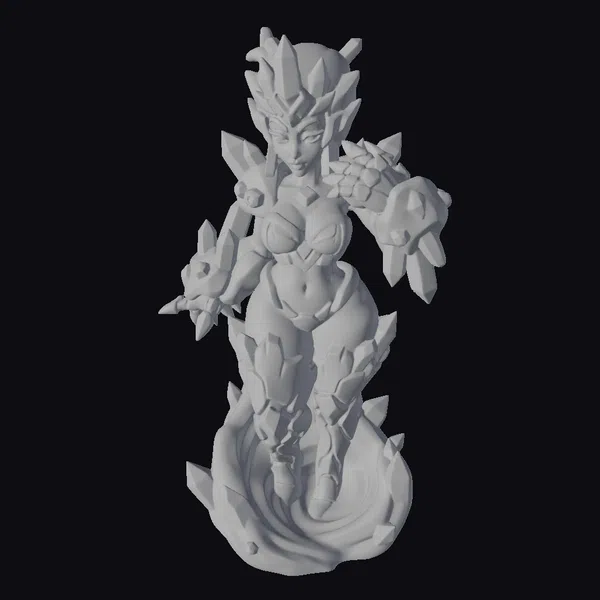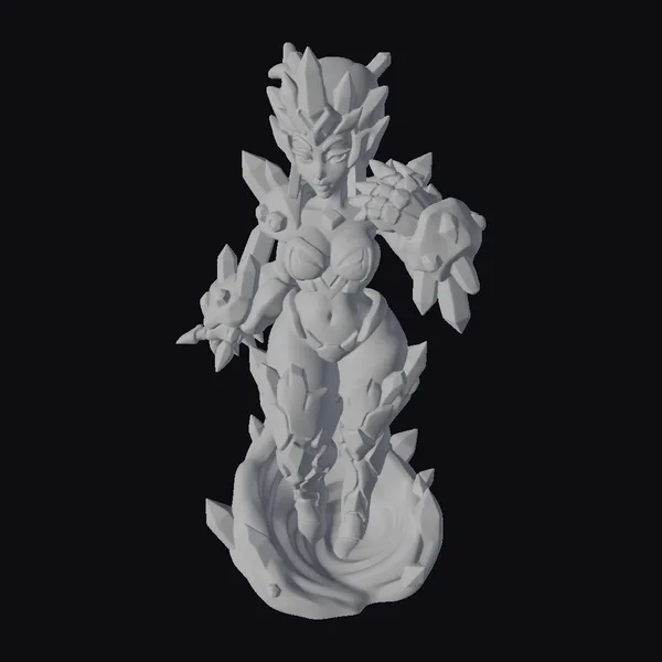 Standing tall with an imposing presence, this fantastical being is encased in a radiant green crystal armor that seems to grow organically from her body. The armor, adorned with sharp, jagged crystals, covers her torso, arms, and legs, while her face is framed by a crystal-encrusted headpiece. Her glowing green eyes exude an otherworldly power, as if she is a guardian of ancient, mystical energies. The base of the model swirls with a fluid, crystal-infused mass, suggesting movement and life. This model is perfect for projects requiring a strong, mythical female presence, such as games, animations, or virtual reality experiences.