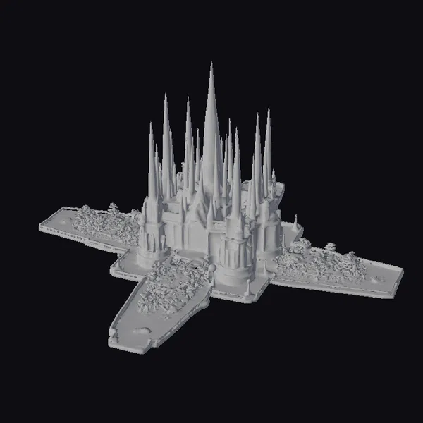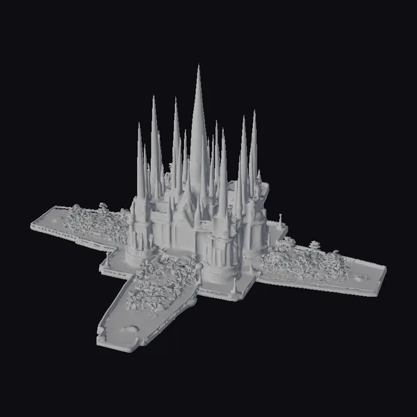 Perched atop a sprawling, cross-shaped platform, this fantastical palace is a marvel of architectural wonder. The central building features a grand, golden-lit entrance flanked by smaller, glowing doorways, while the facade is adorned with numerous, slender crystal spires that rise to dizzying heights, their emerald hue glowing softly. Lush trees and foliage dot the landscape, adding a touch of natural beauty to the scene. The stone streets and pathways feature intricate, curved patterns that add to the sense of mystique. This stunning model is perfect for use in games, 3D printing, VR/AR experiences, animation, and design projects, offering a rich, immersive environment to explore.