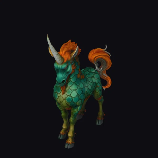 Standing proudly with its legs poised for movement, this fantastical creature showcases intricate details such as textured scales covering its body, transitioning from deep green to lighter green and yellow hues. Its mane and tail flow with fiery orange locks, while a striking white horn protrudes from its forehead. The dragon horse’s expression is serene yet powerful, inviting onlookers into a world of fantasy. Its versatility makes it a prime asset for projects requiring a mythical touch, whether in games, animation, or virtual reality experiences.