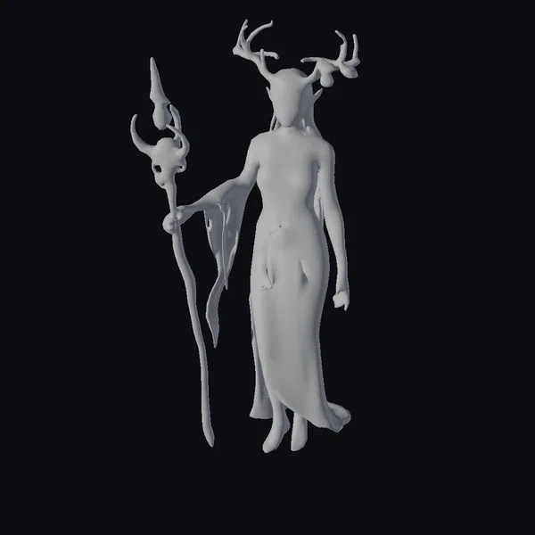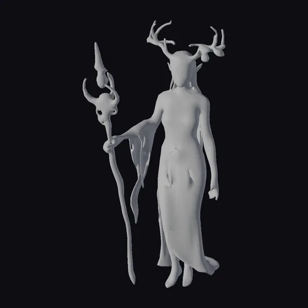 Rendered in exquisite detail, the elf priestess is captured in a serene, statuesque pose, her slender form draped in an intricate, flowing robe that seems to shimmer with a life of its own. The robe’s design is a marvel of fantasy art, with patterns that evoke the natural world, from leaves to the gentle curves of tree bark. Her skin, a radiant emerald tone, is complemented by vine-like tattoos that trace the contours of her face, arms, and torso, pulsing softly with a gentle, otherworldly light. On her head, a majestic crown of antlers, from which sprout leaves and tendrils, further emphasizes her connection to nature. In her hand, she holds a staff that is as much a part of her as her own limbs, its surface adorned with a glowing green crystal and twisted, organic forms that echo the tattoos on her skin. This model is perfect for projects that demand a touch of magic and mystery, from game developers looking to populate their fantasy realms with compelling characters, to artists and designers seeking inspiration for their next creation. Whether for animation, print, VR/AR experiences, or conceptual design, this emerald elf priestess brings a unique blend of mysticism and allure.