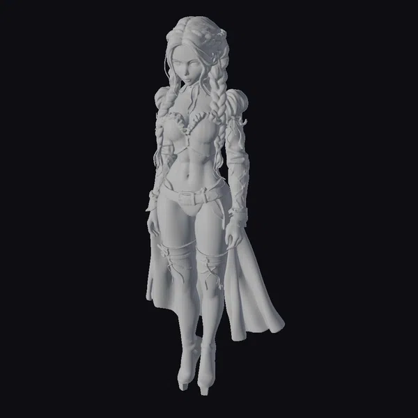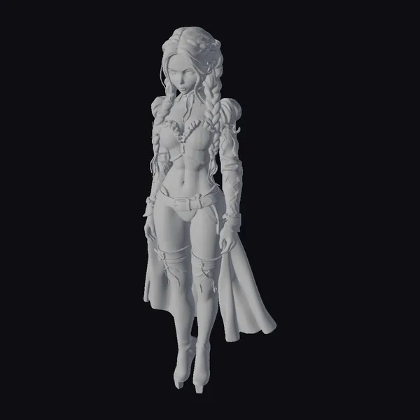 Rendered in exquisite detail, this fantasy female warrior boasts a complex braid wrapped around her head, framing her face as she looks down. Her green armor consists of a braided leather top with white lace trim, a matching thong, and high boots adorned with leather wraps. A wide leather belt cinches at her waist, from which a flowing cape drapes dramatically behind her. The model’s anatomy is finely tuned, with particular attention to her facial features and hands. The quality of the render showcases sharpness and vibrant colors, making her suitable for various applications such as game development, 3D printing, VR/AR experiences, and animation projects.